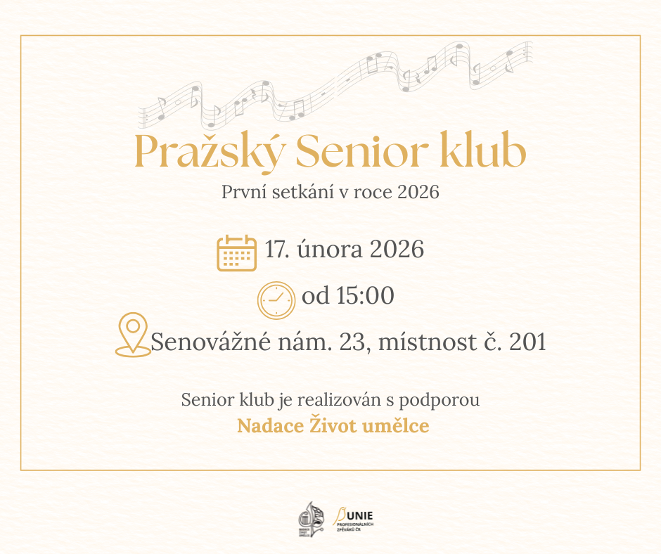 Pražský senior klub 7. 2. 202617. 2. 2026 Srdečně zveme seniory všech pražských základních organizací Unie profesionálních zpěváků na první pražské setkání Senior klubu v roce 2026. Senovážné nám. 23, místnost 201 17. 2. 2026, od 15:00 Těšíme se na společné odpoledne v přátelském prostředí.